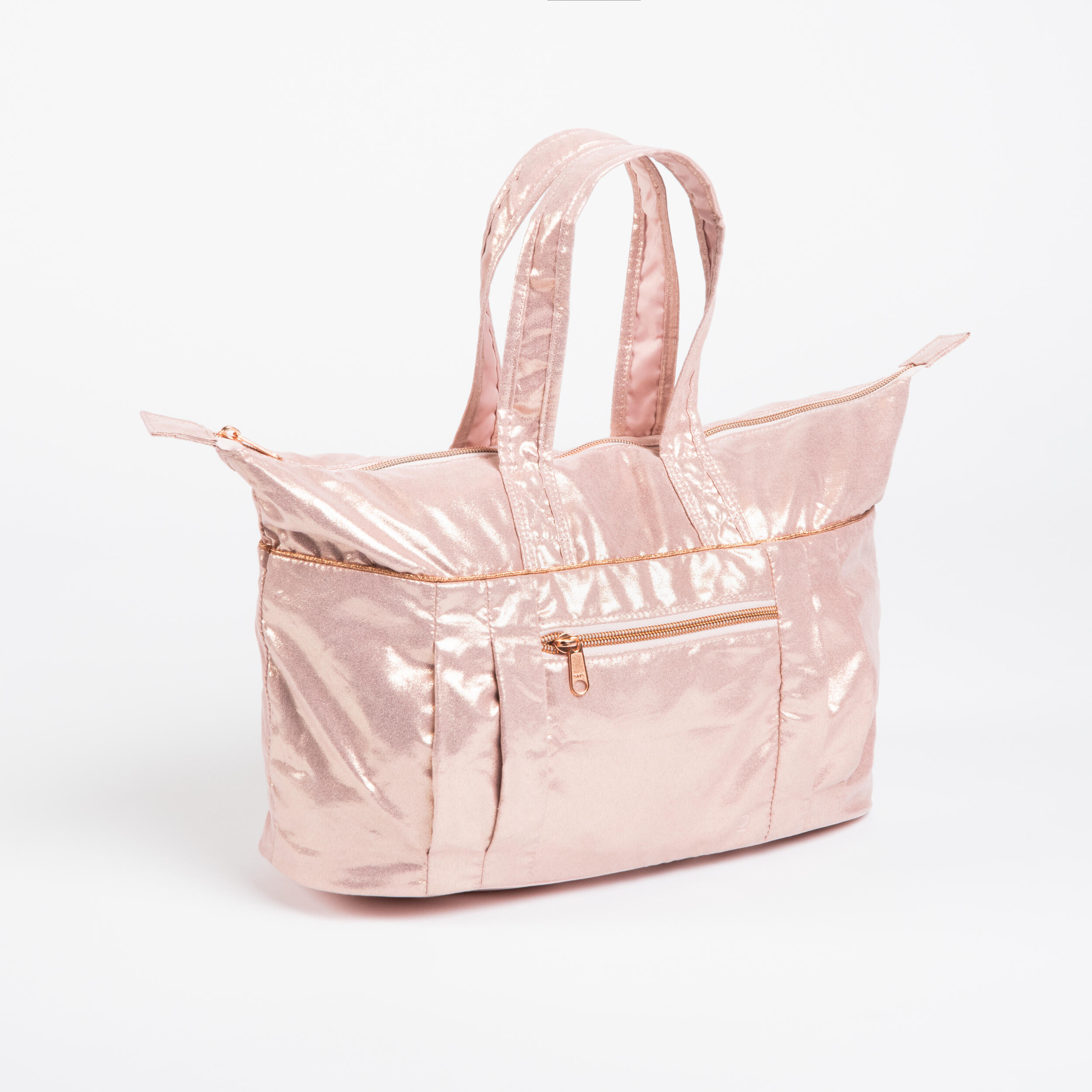 女の子がダンス衣装やアクセサリーを持ち運ぶためのエレガントなバッグです。スポーツバッグをお探しですか?この便利なバッグには、衣装やアクセサリーを整理するための複数のコンパートメントがあり、エレガントなローズゴールド色です。