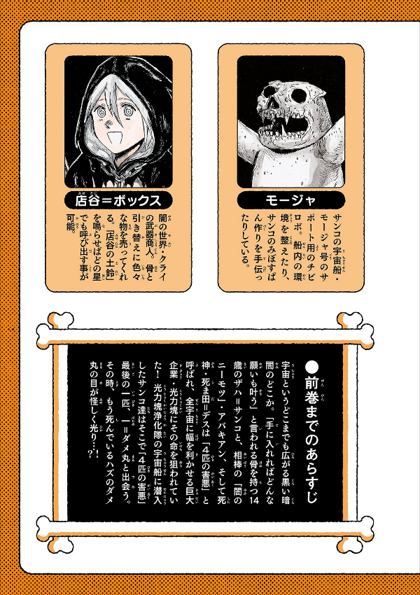 サンコ達が光力塊の宇宙船で出会った謎の死体。それは全宇宙から命を狙われる4匹の害悪最後の1匹、一=ダメ丸だった…! !!重傷を負わされてライトヘッド教団寺院へと連行されてしまった。