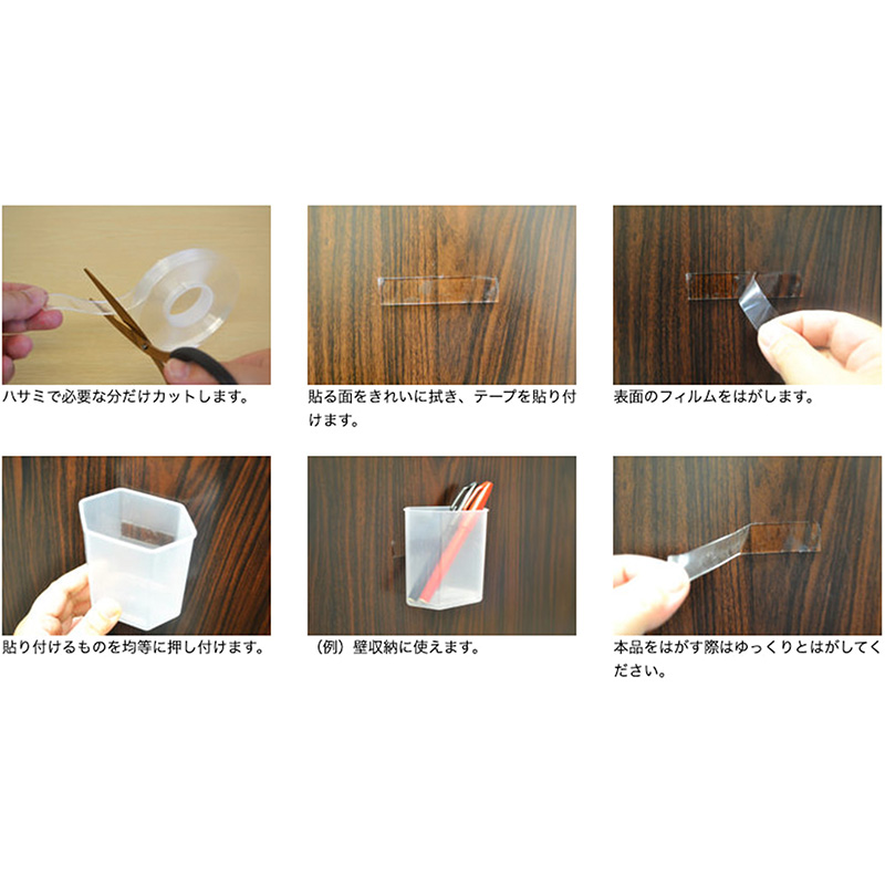 厚みのある透明ゲル素材を使用した両面テープで、適度な粘着力があり、付箋などに適しています。