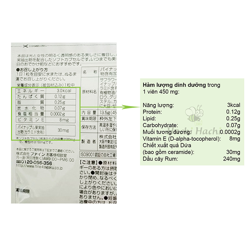 TP:1錠中の栄養成分表示 450mg:ベニバナ油:240mg、パイナップル果実エキス(セラミド含む):30mg、ビタミンE(D-α-トコフェロール):8mg、ミツロウ、脂肪酸エステル、グリセリン…