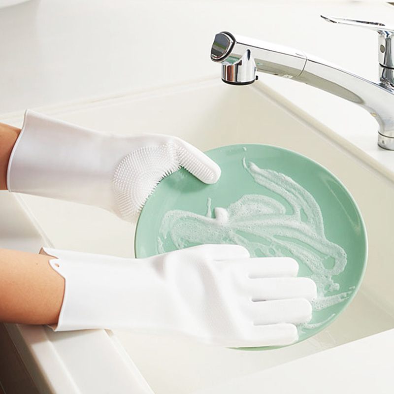 ユニークなデザインの食器洗い用手袋には 2 つの面があります。シリコンの毛皮の面は泡を作りやすく、スポンジを使わずに素早く洗います。