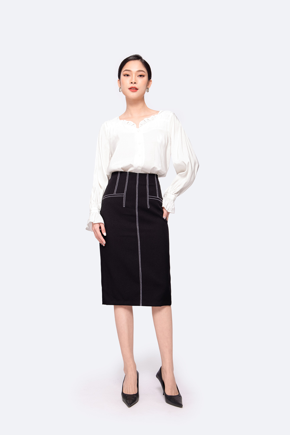 このオフィス スタイルのシャツの白い色は、ペンシル スカート、フレア スカート、ジーンズ、ズボンなどのアイテムとの組み合わせも美しいので、非常に簡単に組み合わせることができます。