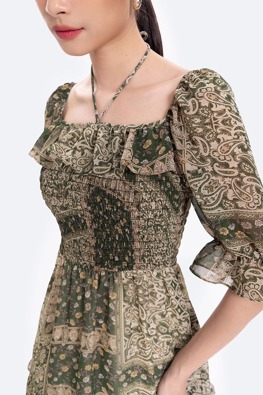 滑らかでなびくフィッシュテールの広がり、フリルのネックライン、素敵な蝶ネクタイのクロス、胸からウエストまで、伸縮性があり快適な伸縮性のあるウエストが完璧なハイライトになります。