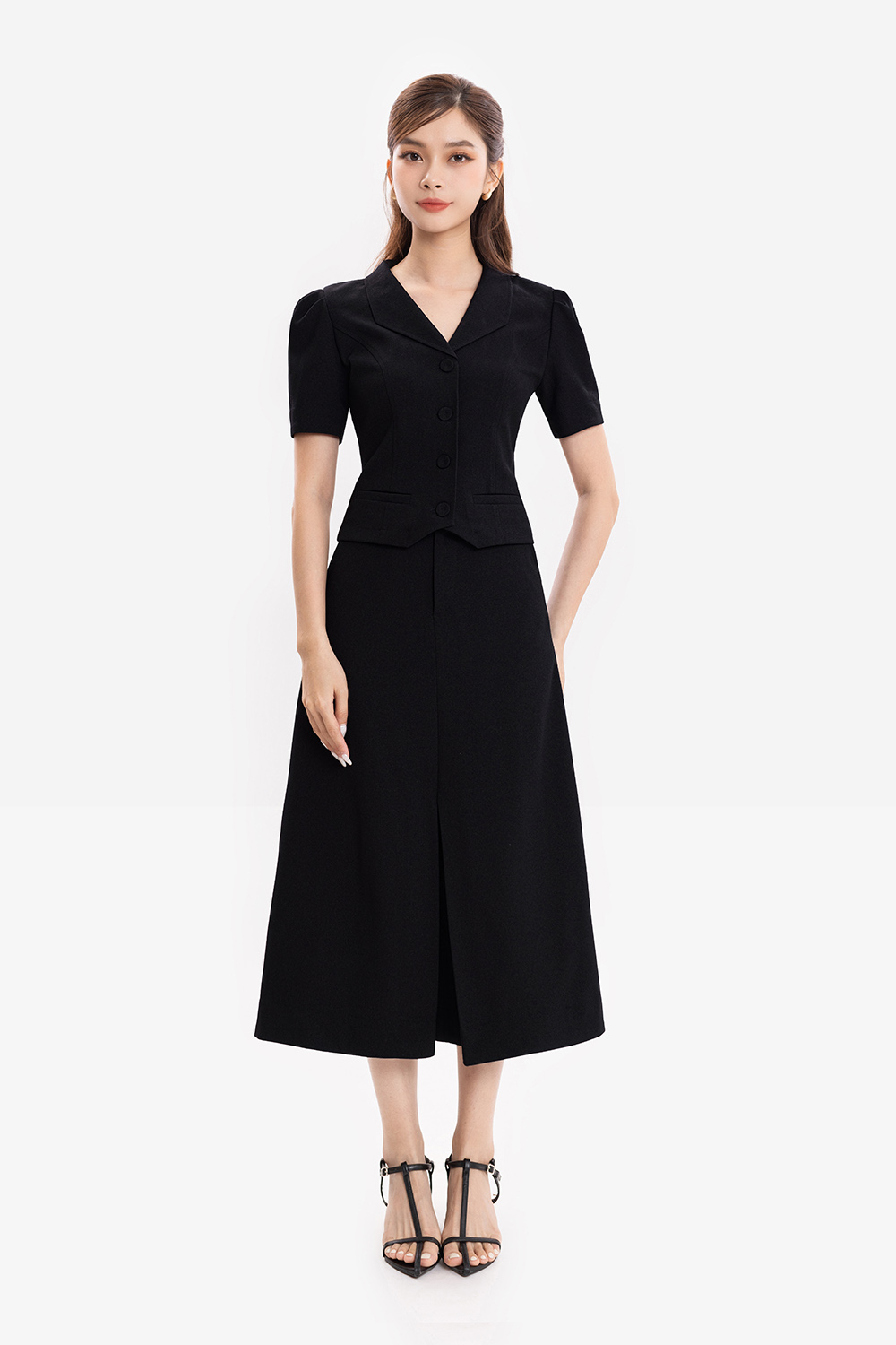 袖とボタンがぴったりとしたAラインのオフィスドレス
