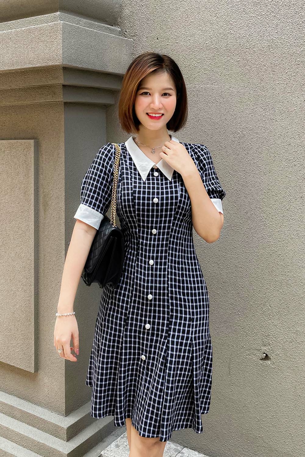 ドレスはわずかに広がった形で、尖った蓮の襟と白い袖の端が、モダンな白と黒の市松模様の背景に際立っています。