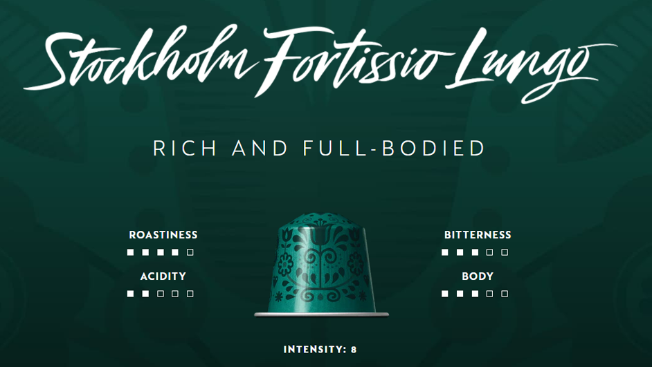 ストックホルム フォルテシオ ルンゴと、インド産とコロンビア産の豆をすべてアラビカ種でブレンドしたものは、ピュアなアラビカ種特有の強いフレーバーとともに滑らかなフレーバーを提供します。